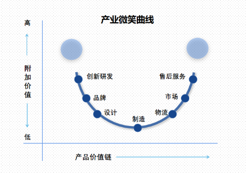 在產業鏈上,利潤高的更多集中在兩端,分別是研發、品牌、市場銷售和售後服務,而從事簡單製造和組裝、代工的企業利潤水平最低。