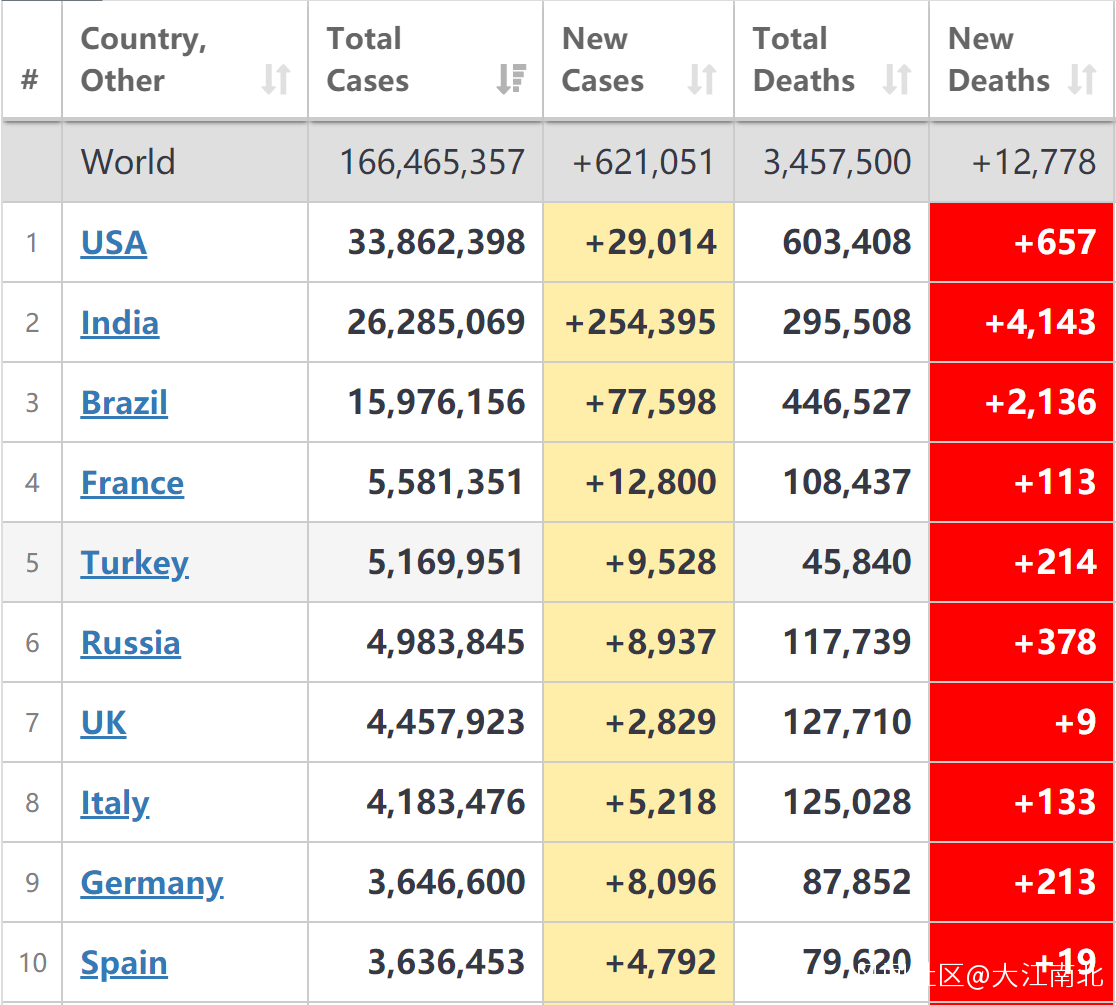5月21日,全球新增新冠確診621,051例;累計確診1.665億例;新增病亡12,778例;累計病亡345.8萬例。