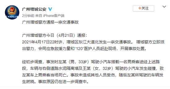 2021年4月17日22時許,廣州增城區一輛特斯拉轎車從一輛行駛的轎車後方超車過程中,撞擊到路邊水泥橋體,損毀嚴重。事故造成特斯拉車上一名乘客死亡,社交媒體上瘋傳一輛特斯拉在東莞東江大道因失控、追尾並致自燃的消息和視頻。畫面顯示,車子燃起的烈火附近,醫護人員正對車禍致傷人員進行搶救。視頻中,一名自稱是這起事故當中的車主稱,其妻的車子被特斯拉追尾——“特斯拉失控,翻了幾下,然後才衝上去追尾的”。