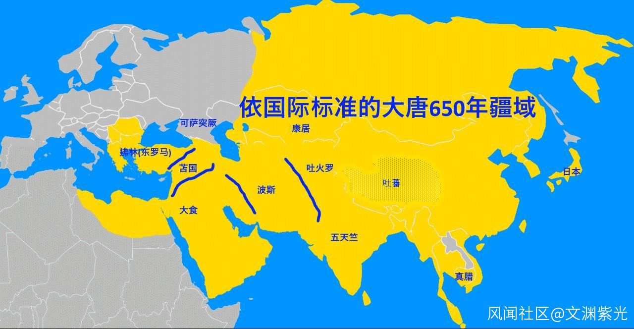 而根據文獻記載大唐的屬國一度包括大食,拂林,日本,天竺,波斯等。所以國際標準下的大唐疆域地圖如下。