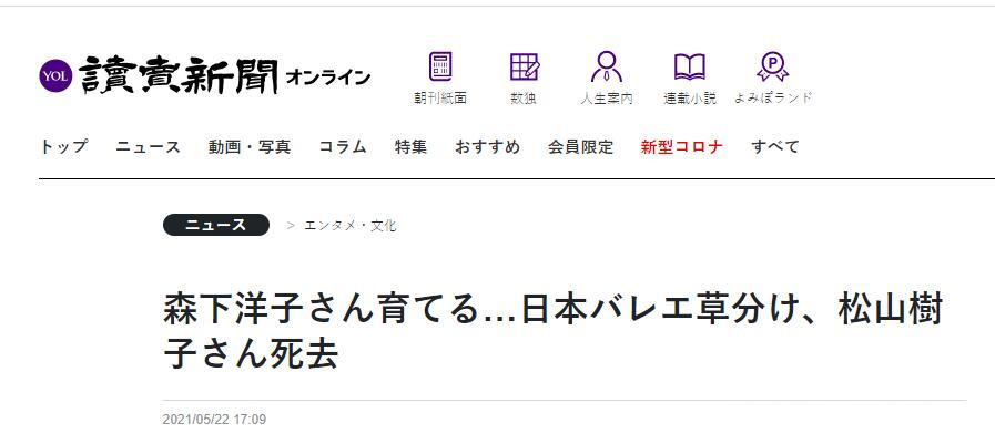 2021年5月22日,日本芭蕾舞界開拓者、松山芭蕾舞團創始人之一、芭蕾舞劇《白毛女》女主角喜兒首任扮演者,為中日友好作出巨大貢獻的松山樹子女士,於當地時間凌晨3時40分因心力衰竭去世,享年98歲。