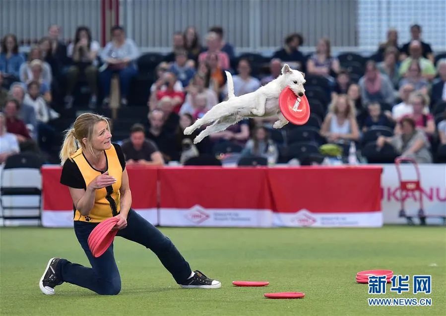 2019年5月19日,在德國多特蒙德舉行的寵物展上,訓犬師沃爾夫帶着愛犬進行“狗接飛盤”表演