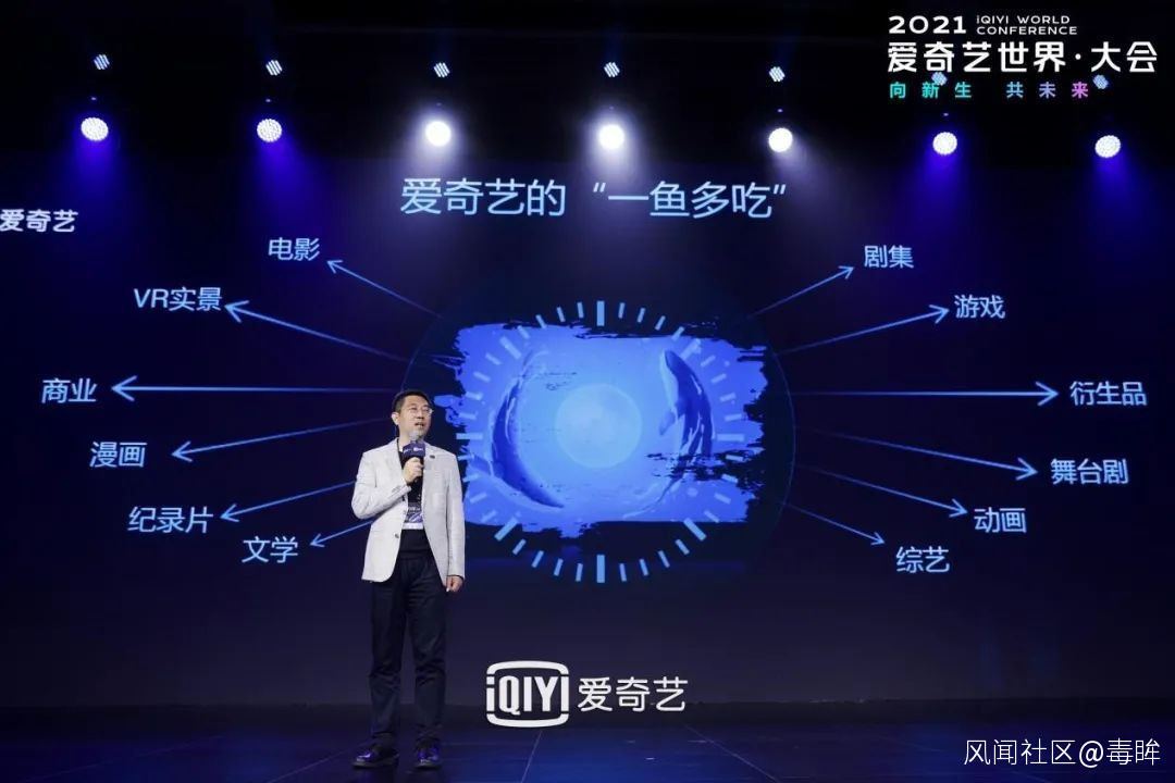 2015年,龔宇提出了蘋果樹的生態模型,這也代表着愛奇藝的基本貨幣化能力。到了2018年上市後,蘋果樹成了蘋果園。由樹成園,就是從單一的視頻內容拓展到文學、漫畫、遊戲、衍生品等眾多品類。在蘋果園中,最大的一棵樹當然還是視頻,因此想要讓其他品類內容也發展起來,就需要視頻業務中的頭部IP內容給予其他樹“養料”,也就是所謂的一魚多吃。