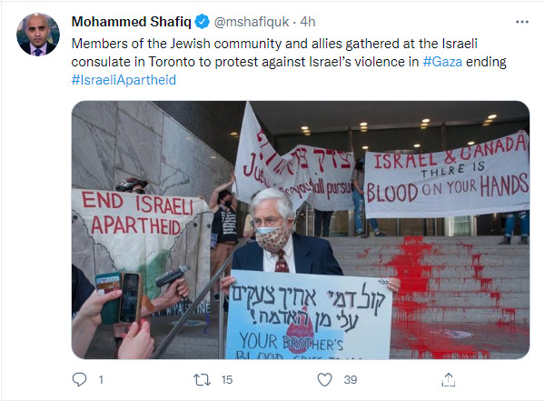 圖源:推特Independent Jewish Voices 的 David Mivasair表示:“以色列駐加拿大領事館再也不能正常工作了。以色列在加沙造成的死亡和破壞,以及以色列在巴勒斯坦各地加劇的暴力,都無法消除。以色列在歷史悠久的巴勒斯坦地區進行了長達73年的殖民計劃。停火並沒有結束不公正和壓迫”他旨在代表加拿大的猶太人,這些猶太人不支持以色列政府的行動,也不支持加拿大近年來向以色列提供的數以千萬計的武器。