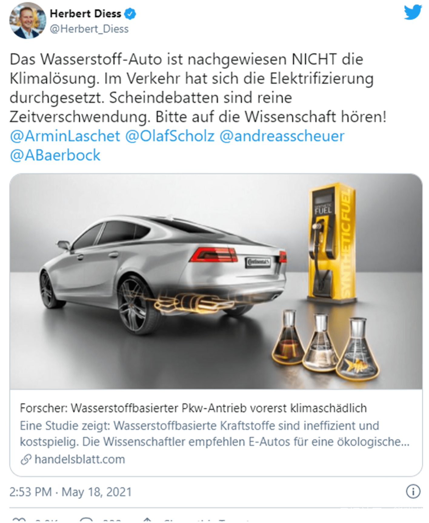 “事實證明,氫汽車不是氣候解決方案。” “在運輸中,電氣化佔了上風。虛假辯論浪費時間,請聽科學!”迪斯的推文還標記了德國運輸和數字基礎設施部長Andreas Scheuer的名字,並鏈接到德國商業報紙Handelsblatt上一篇文章的鏈接。