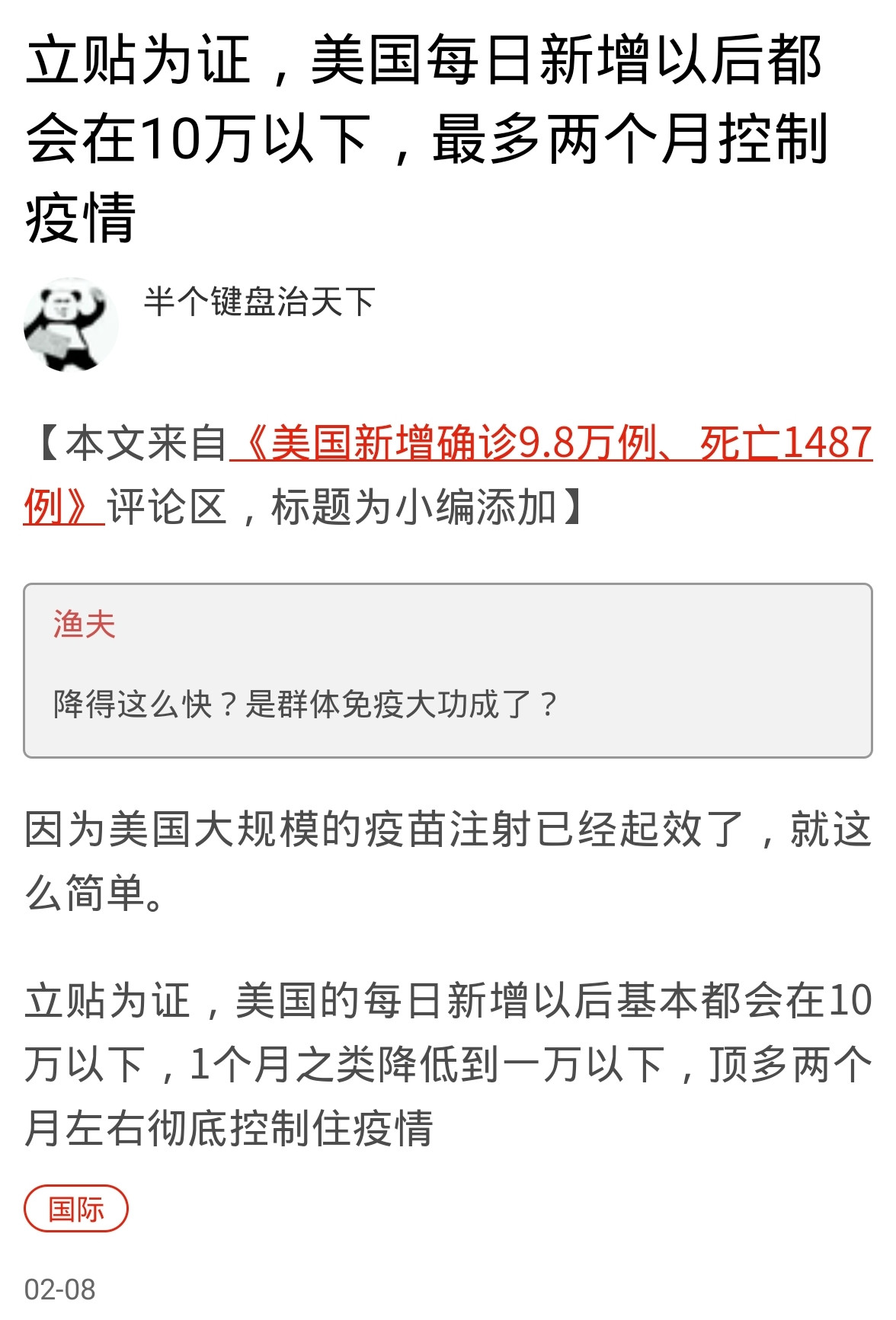 這一條確實過於激進了,與事實略有偏差。願意接受廣大網友的嘲諷和打臉。不過目前美國的每日新增已經降低到了兩萬左右,以目前的形勢,在三個月之內,美國每日新增病例降低到一萬以下基本是沒問題的。