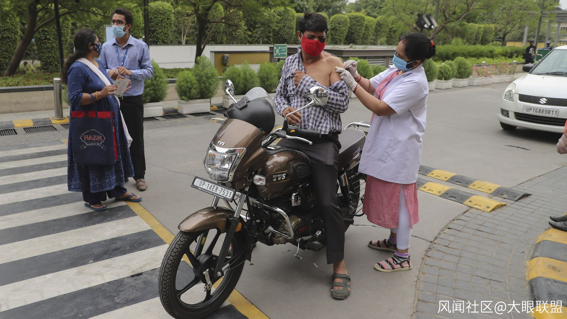 印度新冠肺炎疫情:圖為5月17日,印度新德里市郊一名男子在免下車疫苗接種中心,接種新冠疫苗。