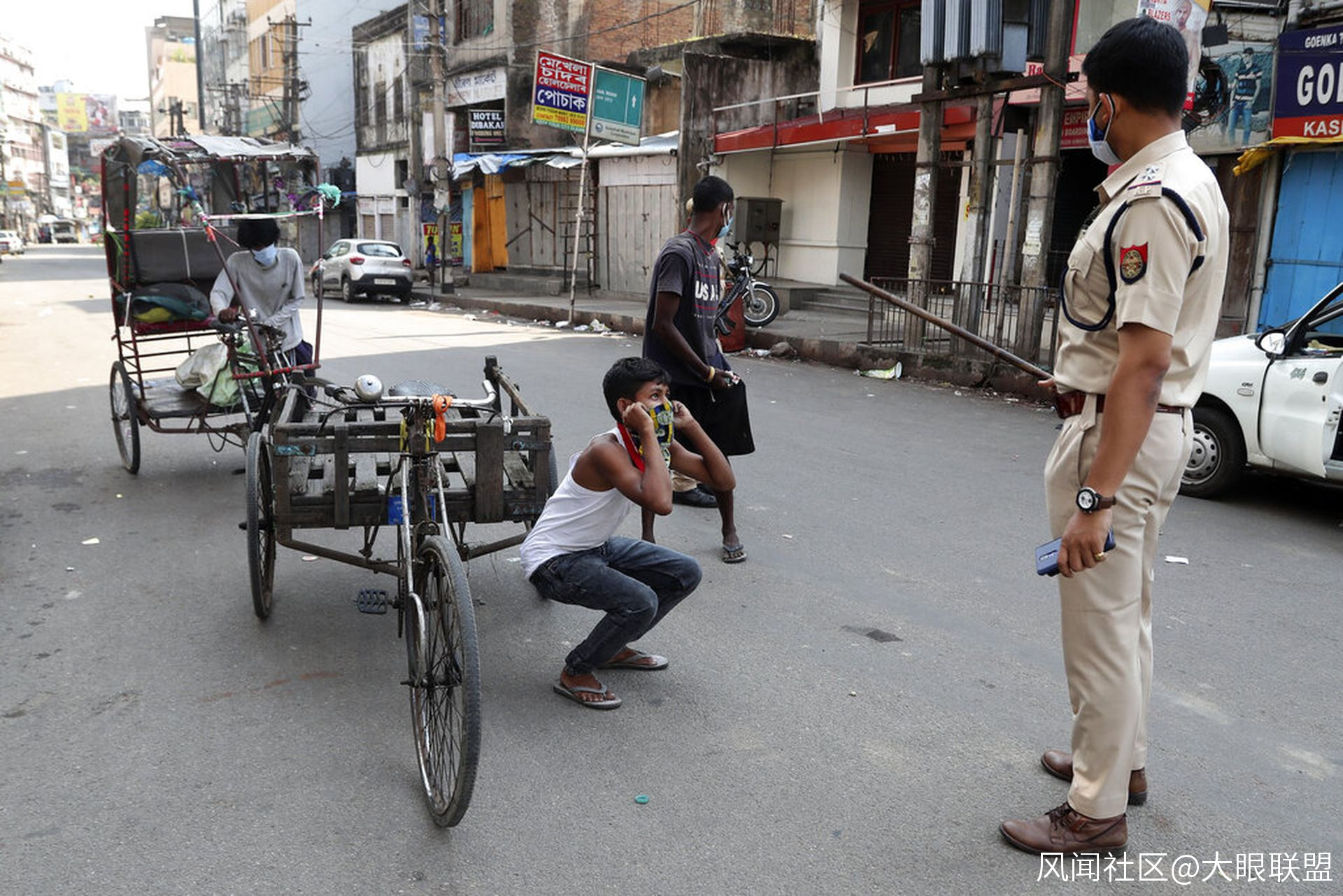 印度新冠肺炎疫情:圖為5月14日印度高哈蒂有警員在懲罰違反防疫規定的男子。(AP)