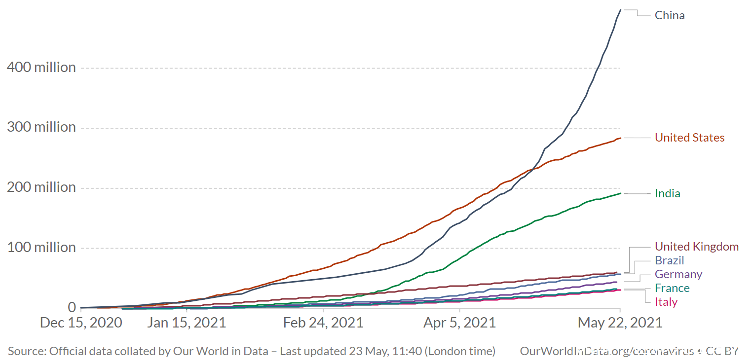 截止2021年5月22日,美國累計接種2.84億劑,居第二位,其中單日新增接種234萬劑。美國至少接種一劑的人羣佔比為48.6%,完成兩劑次的人羣佔比為38.6%。美國每百人累計接種84.90劑,是中國的2.46倍,兩者的差距從5月9日的每百人55.13劑縮小到5月22日的每百人50.35劑。自3月23日以來,美國日均接種258萬劑,為中國同期日均接種數的37%。