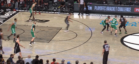 最有意思的是這個球:第三節3分50秒,布朗來給歐文掩護的時候,綠軍選擇了雙人夾擊,歐文把球分給到禁區的布朗,布朗再給左側底角的格林,富尼耶過來補防,格林信手一傳給到45度的喬-哈里斯,喬哈接球命中三分。