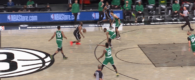 這就是最典型的籃網配合,但按理來説,綠軍採用無限換防,籃網應該是打不出這種配合的,此處恰是籃網三巨頭的恐怖之處。