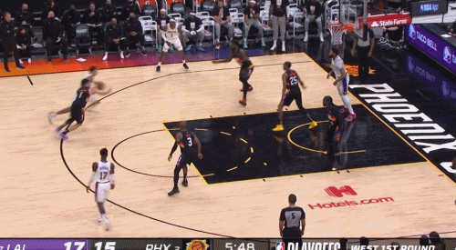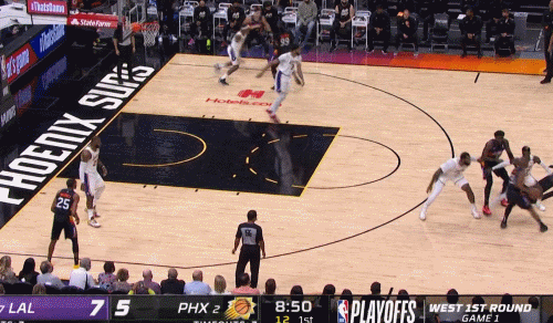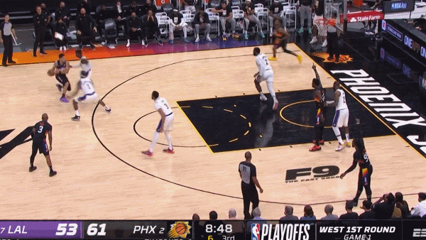 對太陽幾乎整場被動,首先是進攻不順引起。有德拉蒙德的“雙塔”進攻空間小,抑制了戴維斯、詹姆斯和外線球員的突破空間,然後湖人輪換改用小陣容,內線反而不如太陽隊。