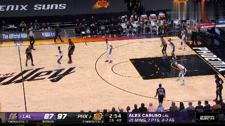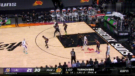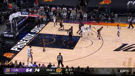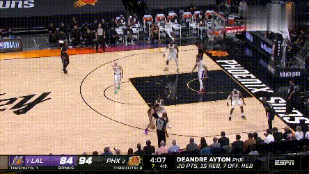 湖人對這種進攻並非沒有辦法。濃眉在45°三分線固然不容易去護筐,他的刷卡協防按説也能干擾布克,逼他提前停球——然而濃眉沒有這麼幹,他協防意識時好時壞。