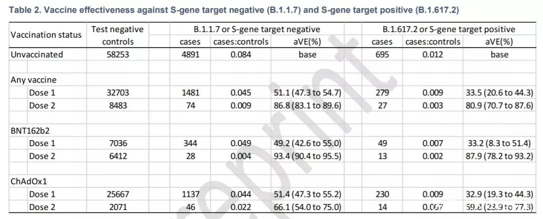 研究人員使用了兩種不同研究手段將疫苗對B.1.617.2和B.1.1.7的保護能力進行了比較,並且得出非常相似的結果。研究結果顯示,接種兩針輝瑞(Pfizer)/BioNTech聯合開發的mRNA疫苗2周之後,預防因B.1.617.2感染出現的有症狀COVID-19的效力為88%,預防因為B.1.1.7感染出現的有症狀COVID-19的效力為93%。