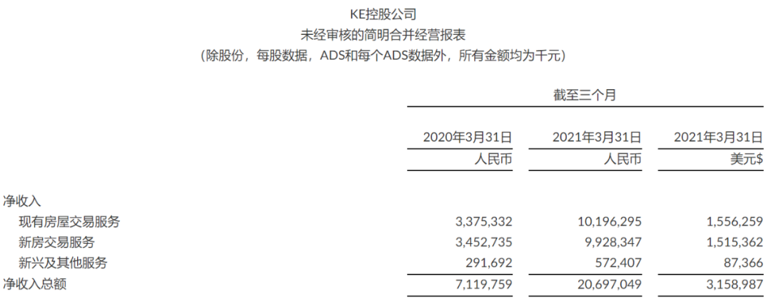 今年一季度,貝殼的營收為207億元,同比大增了190.7%。如此高的增速,其實和去年同期的起點低有關,去年同期貝殼的營收只有71億元。
