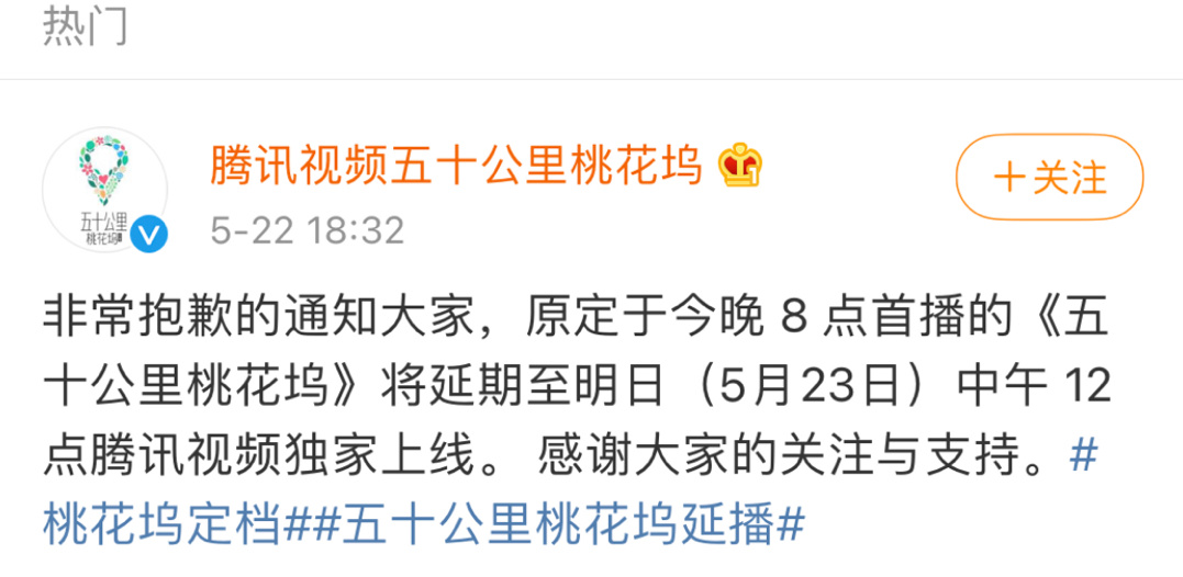 5月22日,原定於當天晚上開播的新綜《五十公里桃花塢》(以下簡稱《桃花塢》)延至次日中午開播。