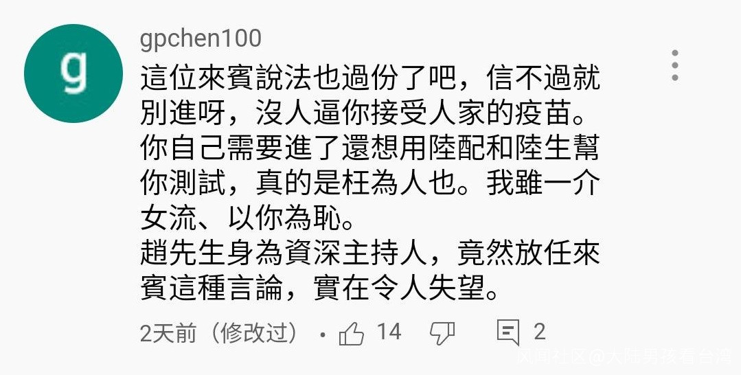 有網民認為,如果不相信大陸疫苗就別進,“沒人逼你接受人家的疫苗;你自己需要進了還想用陸配和陸生幫你測試,真的是枉為人也”。