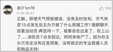 25日,觀察者網專欄作者腓特烈在文章中表示,無論在極小範圍(如白銀賽事的賽道)對天氣進行預報,在技術上是否能成立,突發的惡性天氣,都不應成為賽事主辦方規避應盡責任的理由。