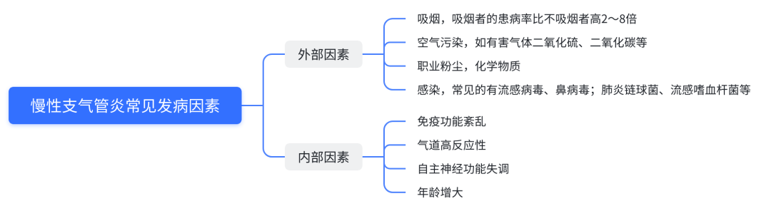 本病病因尚不完全清楚,其發病主要可分為外部因素和內部因素,其中感染是慢性支氣管炎發生發展的重要原因之一,而煙霧、粉塵等是容易引起復發的重要因素。
