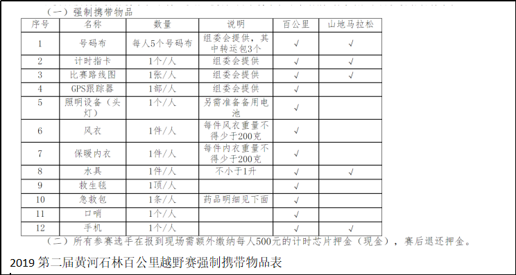 之前的一屆,2019黃河石林百公里越野賽在規定上還是多了保暖內衣、急救包等,但依然沒有強制要求帶衝鋒衣。