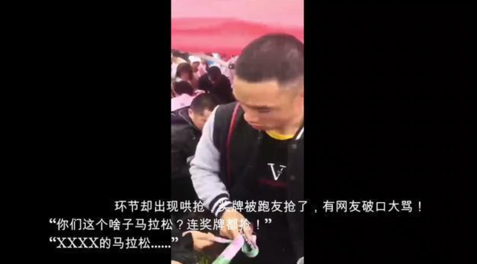 就在一個月前,貴州畢節山地馬拉松賽上,眾多參賽者擁擠在終點附近爭搶獎牌,有人為搶獎牌往別人身上踩踏。