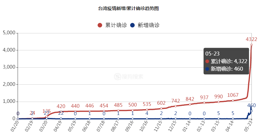 從5月15日起,台灣的疫情曲線圖畫出了一條接近90度的增長線條,並連續一週每天新增100人以上,貢獻了國內90%以上的新增感染病例,21日,台灣又新增了314例確診病例。