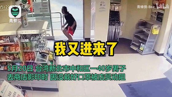 5月20日,台灣新北市一名40歲男子去商店影印,因沒戴好口罩被店員勸阻,結果他在結賬後脱下口罩,在店門口反覆橫跳,嘴裏還不停喊着“我又進來了,我又出來了”,最後還囂張地表示“來打我啊笨蛋”。