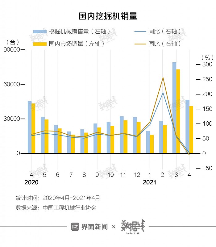 據中國工程機械行業協會數據顯示,去年中國挖掘機銷量共32.76萬台,同比增長近四成,刷新歷史紀錄。自去年4月至今年3月,增速已連續12個月超過五成。