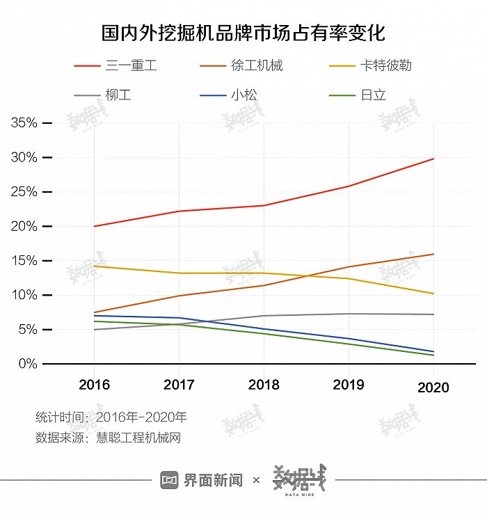 據慧聰工程機械網統計數據顯示,2016年-2020年,外資品牌卡特彼勒的市場份額從14.2%降至10.3%,小松和日立則分別從7%、6.2%下降至2.45%和1.85%。