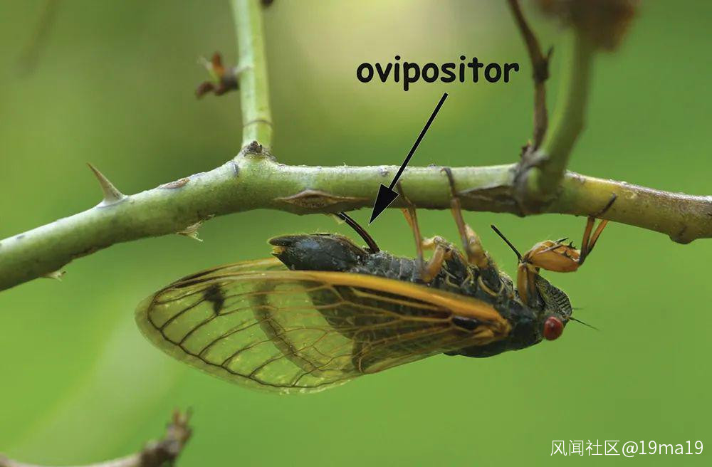 將接近現有種羣數量 300 倍的下一輩蟲卵偷偷塞進樹枝裏,等待它們在 17 年後從地下冒出,接下來的成功羽化!