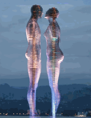 “阿里與尼諾”通過巧妙的設計,讓代表阿里和尼諾的兩尊雕塑保持着移動的狀態——越走越近、擁抱接吻、融為一體、分道揚鑣,並週而復始。由於雕塑移動得非常緩慢,且靜默無聲,如果你只是匆匆一瞥可能不會發現其中的機關,既有雕塑的靜態感,又有演繹的動態感。