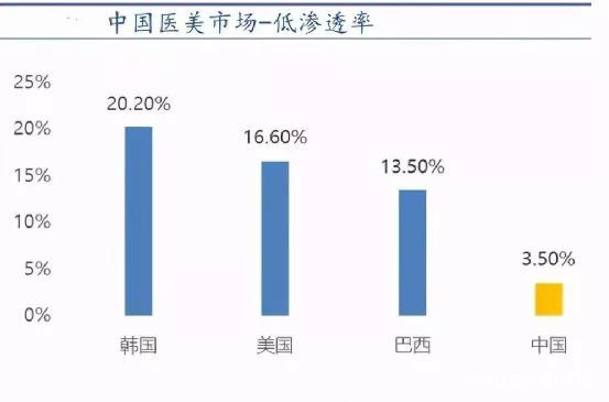 根據國金證券研究預計,2023年中國醫美市場規模將達到3115億元。同時據弗若斯特沙利文統計,2019年中國的醫美滲透率僅3.5%,遠低於日本的11%,美國的16.5%,韓國的20%的水平。