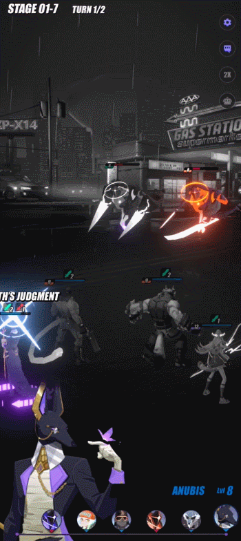 為了貼合人類獲得神力的遊戲背景,角色的美術設定更像是神話元素與近未來文化符號的結合。我認為其設計的核心還是突出時髦的近未來感。比如,埃及神話中與死亡掛鈎的阿努比斯,在遊戲裏身穿晚禮服,展現了他的嚴肅莊重;瓦爾基里作為北歐神話中的女武神,形象設計則走了搖滾路線,彰顯個性。