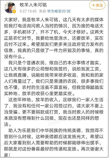 27日,這位名為朱可銘的當地牧羊人在微博上做出回應,表示自己只是做了一件力所能及的事情,也不想與那些前來與他簽約、讓他做直播的公司合作,呼籲大家不要上當受騙。