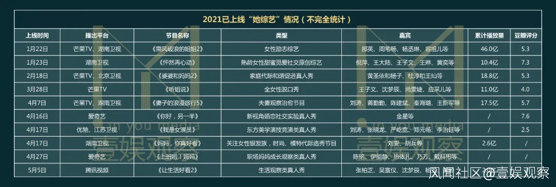 壹娛觀察(ID:yiyuguancha)總結了今年截止到目前已上線的“她綜藝”,發現有10檔左右的節目已經播出,這還不包括平台為開拓“女性賽道”所推出的諸如戀愛、社交等其它品類節目。
