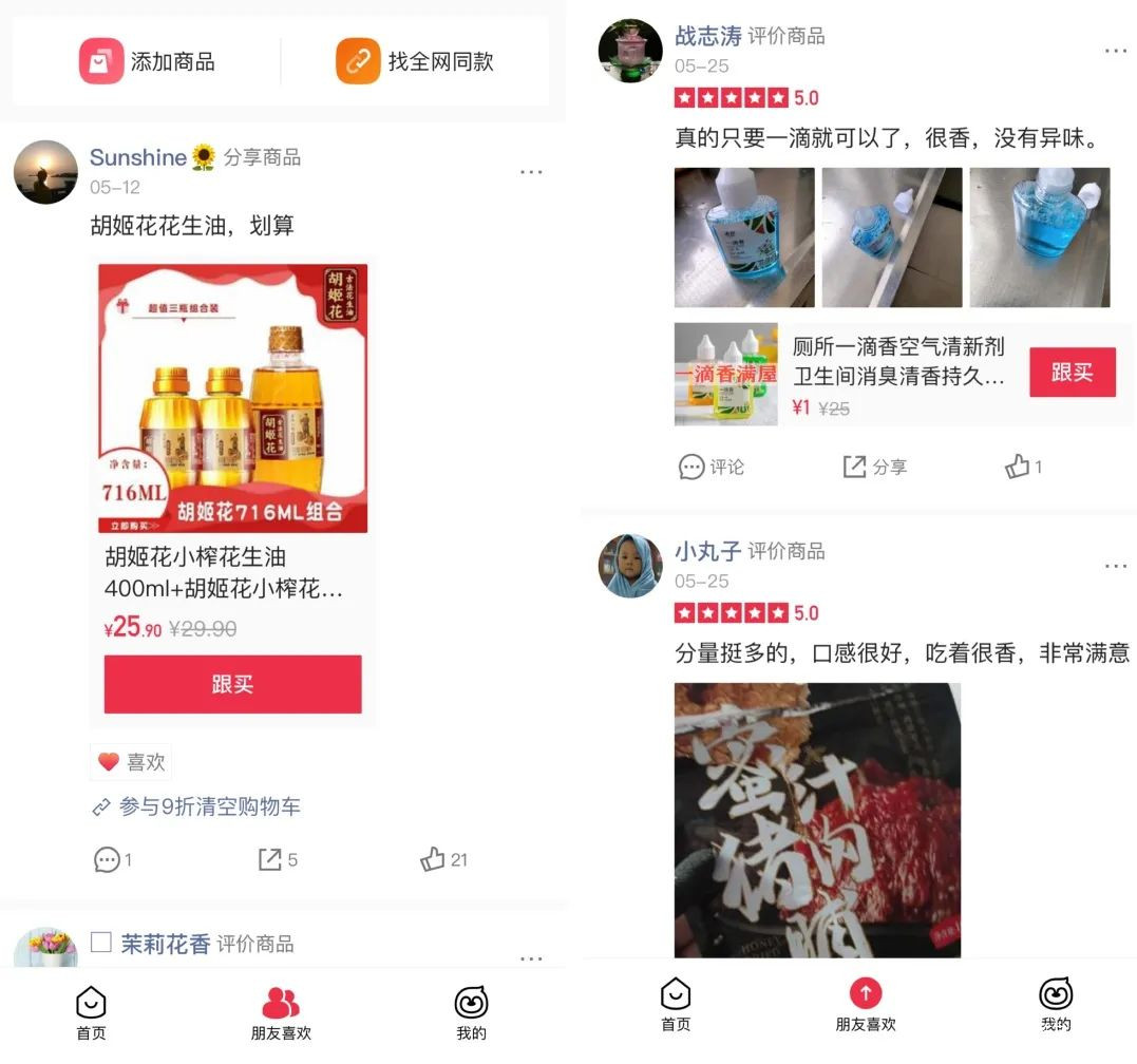 底欄分有“首頁”、“朋友喜歡”和“我的”三大欄目,其中“朋友喜歡”則包含着小鵝拼拼想要通過培養KOC來種草用户、實現裂變的願望。不可否認的是,小鵝拼拼背後擁有微信龐大的流量支撐,就社交功能而言,騰訊擁有絕對的優勢。