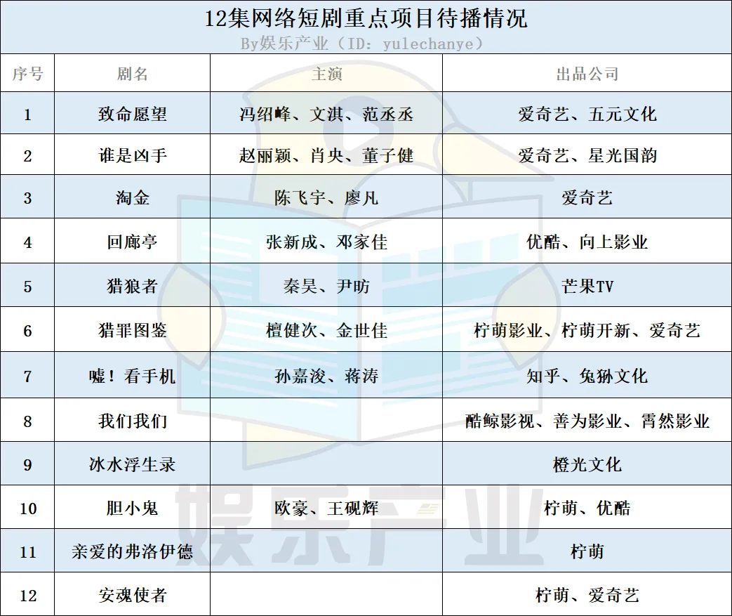 頭部12集精品短劇幾乎都是平台自制的項目,娛樂產業(ID:yulechanye)整理了待播的12集網絡劇重點項目,共有12部,其中愛奇藝有5部,優酷2部,芒果TV1部,還有3部劇集播出平台未知。