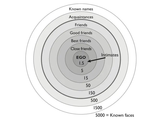 牛津大學進化心理學家羅賓·鄧巴(Robin Dunbar)曾經提出過著名的鄧巴數字——**150定律,****人類智力允許人類擁有的穩定社交網絡的人數是148人,約150人。**大概就是人們生命裏會遇到的與自己擁有穩定社會關係的人的數量。