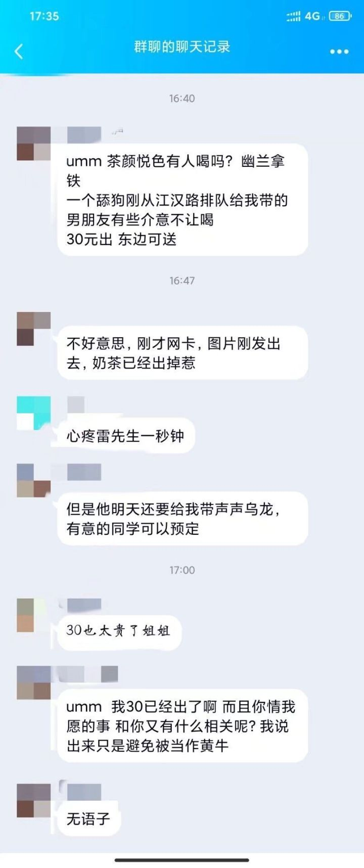 第五個網友:考入大學的人,多少有點腦子吧?這事至少涉及到三個人,買奶茶的男學生,拍賣奶茶的女學生,還有女學生的男朋友,這三個人就沒有一個想到,這種人際關係很危險嗎?