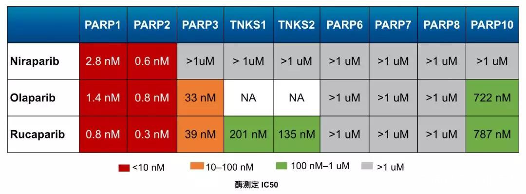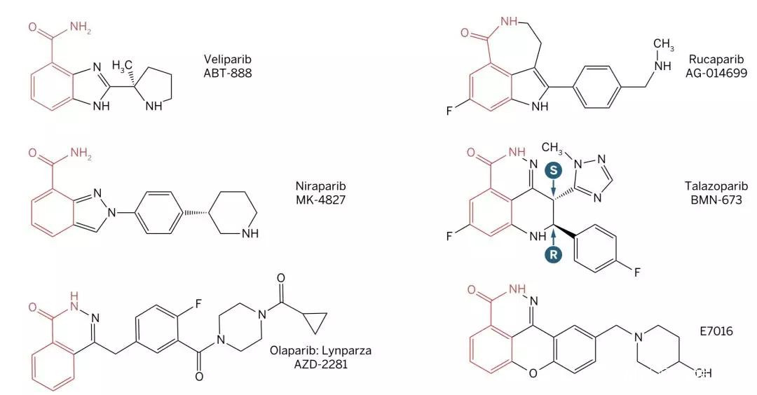 目前在臨牀中使用的所有PARP抑制劑,都有一個與NAD+競爭結合PARP的煙酰胺部分,因此它們抑制PARP催化活性的能力是類似的;然而,由於不同的抑制劑結構存在較大差異,它們對不同PARP家族成員的選擇性存在一定的差異。