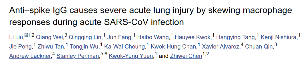 2.Liu, L., Wei, Q. Lin, Q. Fang, J. Wang, H. Kwok, H. Tang, H. Nishiura, K. Peng, J. Tan, Z. Wu, T. Cheung, K. W. Chan, K. H. Alvarez, X. Qin, C. Lackner, A. Perlman, S. Yuen, K. Y. & Chen, Z. (2019). Anti-spike IgG causes severe acute lung injury by skewing macrophage responses during acute SARS-CoV infection. JCI insight, 4(4), e123158.https://doi.org/10.1172/jci.insight.123158