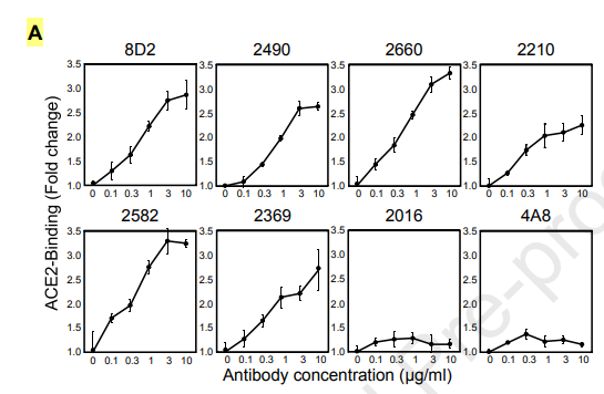 如圖,8D2、2490、2660、2210、2582和2396這幾個結構亞型隨着抗體濃度升高,使得新冠病毒與ACE2結合的水平升高,與之相對照2016和4A8則沒有這樣的隨着濃度變化的ADE反應。