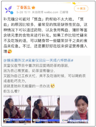 吳宣儀稱因為貧血一天喝8杯奶茶補充能量,丁香醫生:幫助不大_風聞