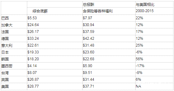 以下圖表顯示幾個國家製造業工人的報酬情況。根據有些機構的測算,2015年,中國一個工人每小時的總報酬為4.9美元,印度為1.86美元,美國工人為37.71美元。需要指出,美國的製造業工人的報酬也是因行業而異,例如,航空業的工人每小時報酬超過38美元,而一些相對低端的行業每小時報酬在18美元左右。