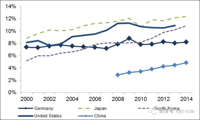 美國2000年在製造業的研發投入佔製造業銷售的8%,2012年增加到11%,日本和韓國的投入與美國接近,中國2014年的投入約5%。