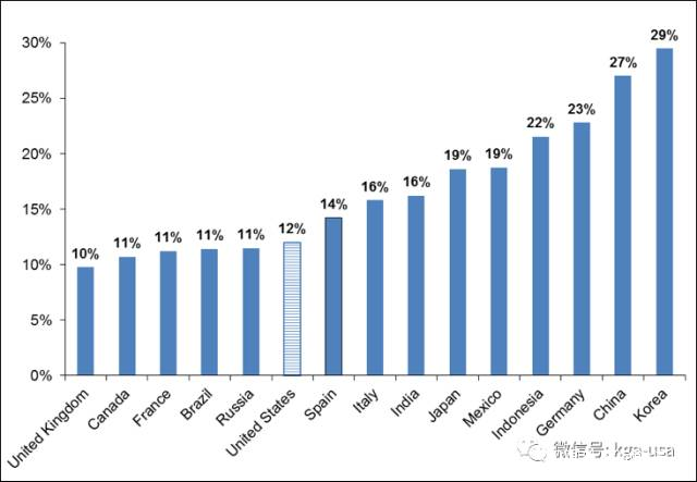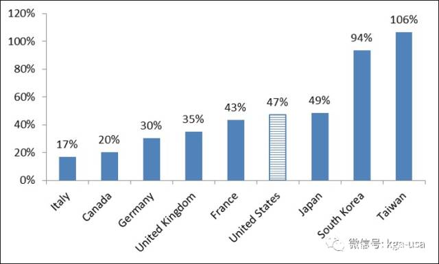 2015年,美國製造業在GDP中的比重為12%,韓國為29%,中國為27%。