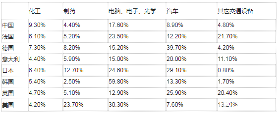 美國大量投入“高科技領域”的研發,尤其是製藥、電子和飛機制造,而其它國家例如韓國,研發更多投入於“中端科技領域” 例如汽車和機械製造。從以上表格看,大多數國家對電腦、電子和光學領域的研發投入都很重視,美國在製藥方面的投入遙遙領先。