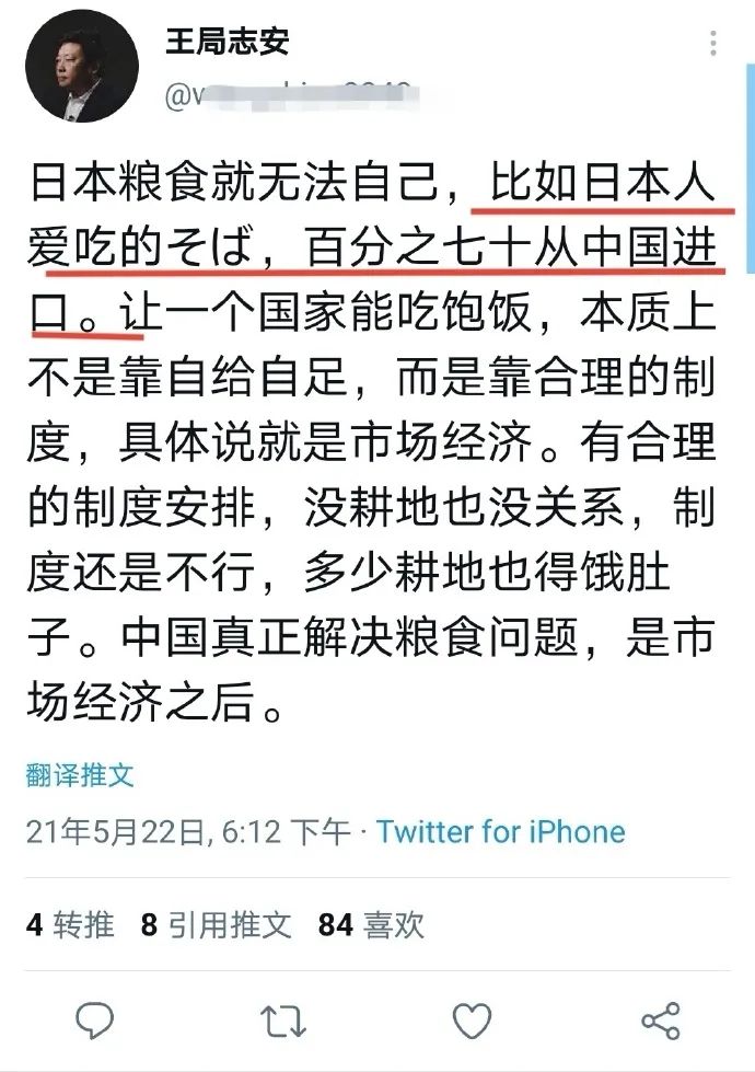 言外之意,就是説中國應該學學人家日本,70%的糧食靠從中國進口,所以中國的飯碗根本就不用掌握在自己手裏,靠買買買就行了。