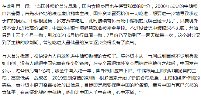 其實總結下來,就是你買中國的糧食,中儲糧就拋售,始終維持住國內的糧價,最後拋的那些國際大投機商們都打了退堂鼓,不敢買進了,最後中儲糧居然説還存着夠中國人吃一年的糧食……