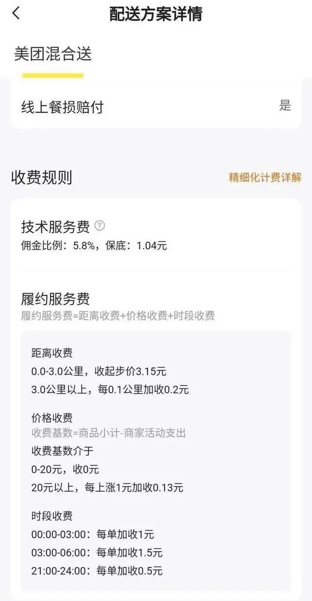 而履約服務費則是大眾語境下的配送費,涵蓋了支付騎手的工資、補貼、人員培訓管理等費用,是在商家選擇平台配送時產生,價格也會隨着訂單價格、配送距離、配送時段影響而動態變化。